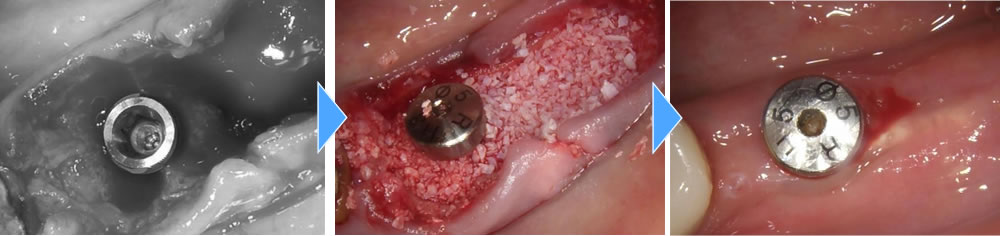 一番奥の歯だけではなく手前の歯にも感染が拡がっていたため、2本の歯を抜歯後にインプラント1本を埋入し、骨が無くなってしまっている部分に骨を作る処置を一度のオペで行いました。