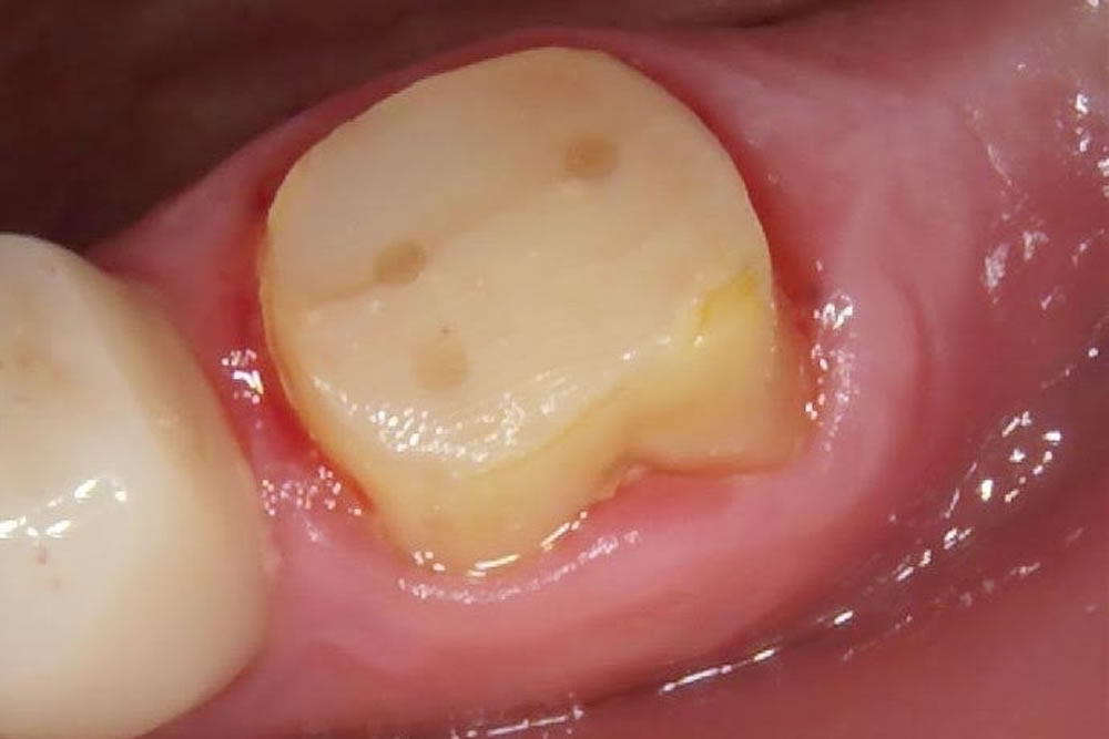 神経が無い歯でしたので、まず上の銀歯と中に入っている金属の土台を除去し、虫歯の処置を行いました。