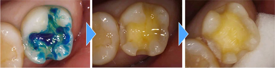 むし歯検知液を使用し、むし歯がしっかりと取り切れたかどうか確認後、神経の保護をしてから型取りをしました。