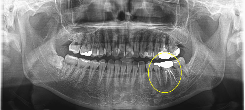 レントゲン検査の結果、過去に他院で治療された第一大臼歯の歯の根っこに膿が溜まっていることが確認できました。