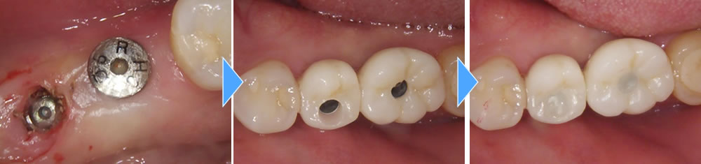 インプラントと顎骨の結合期間を経て、上部構造を製作しました。その後、完成した上部構造をインプラントに装着し、咬み合わせを調整して治療完了です。