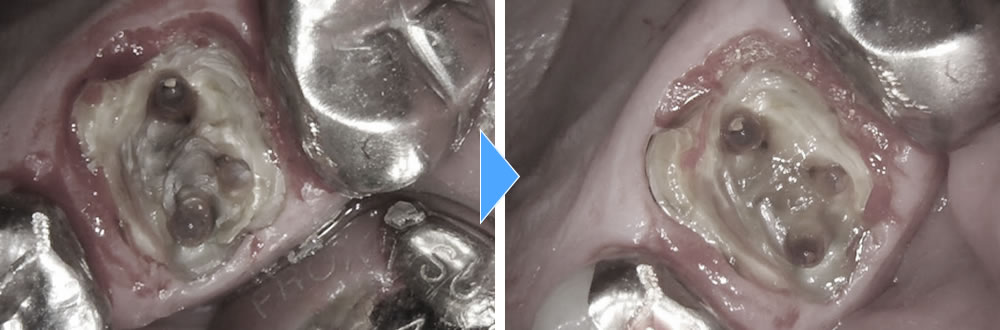 さらに、金属の土台を除去した後、虫歯治療を実施しました。虫歯の中で歯に着色がおきている箇所は薬液を使用して虫歯でない事を確認し、着色は取らずに治療を行いました。