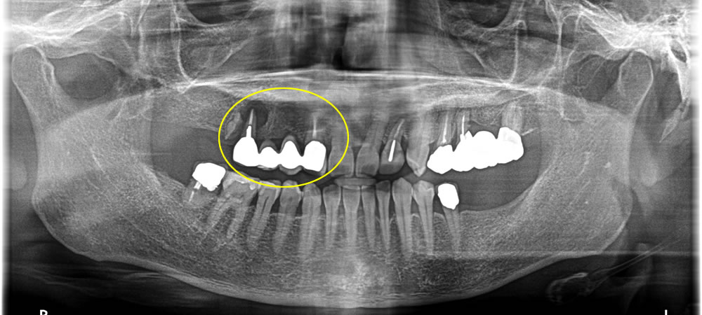 レントゲン撮影での検査の結果、過去に他院で治療されたブリッジの根っこが感染によって膿が溜まり、炎症を起こしてることが痛みの原因であることがわかりました。