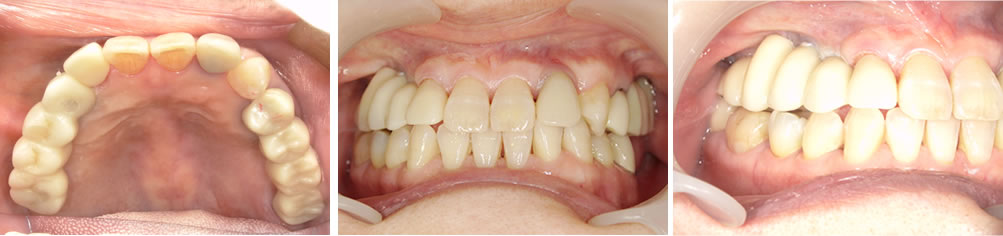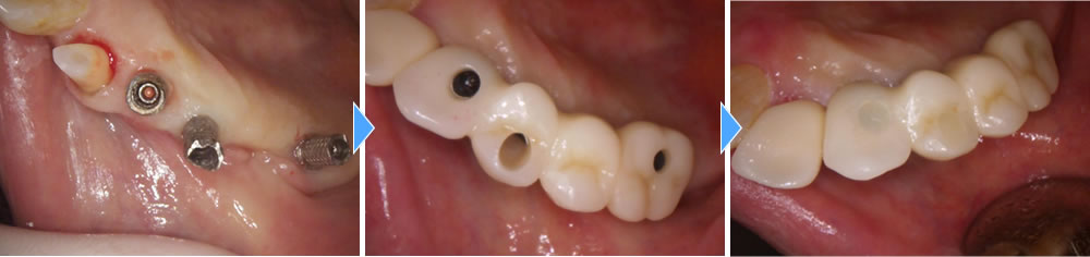 ブリッジの手前の歯はまだ使うことができると判断し、ブリッジ除去後、一本のかぶせ物にしました。奥の歯は抜歯後、下の歯と奥まで噛み合うように設計し、金額を抑えるため、本来4本分の歯をいれるところをインプラント3本でブリッジにし、4本分の歯を作りました。奥の歯は骨の損傷が大きかったため、抜歯と同時に骨造成も行っています。