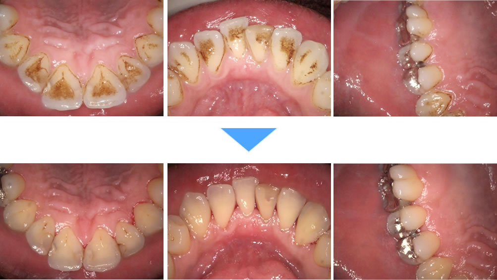 こちらの患者さまは、歯の着色と落としたいとの主訴で来院されました。エアフローを使用し、上下顎の歯面清掃を実施いたしました。結果、歯面に付着していた着色汚れが落ちて綺麗になりました。また、着色でわからなかった虫歯も発見する事ができ、今後は虫歯の治療を行っていく事になりました。
