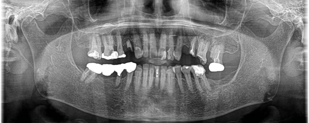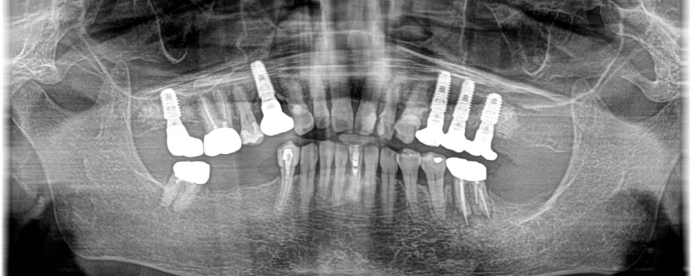 歯医者がかなり久々とのことで、むし歯により歯が根本から折れてしまった部位や、むし歯が大きく感染をおこしてしまい残すことができない歯を抜歯し、インプラントを埋入しました。