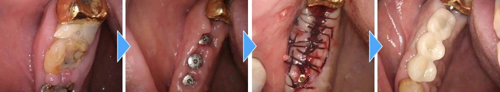 感染により骨が大きく損失してしまっている部位には骨造成を同時に行い、なるべくインプラントの持ちが良くなるようにしました。治療後は今まで噛むことが出来なかった部位でしっかりと噛むことが出来るようになり、大変満足していただいております。