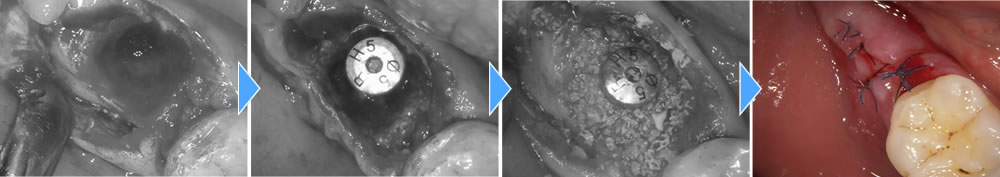 歯根が破折した歯をを抜歯し、計画通りの位置へインプラントを埋入しました。インプラントの持ちをなるべく良くするため、骨造成も同時に行っています。
