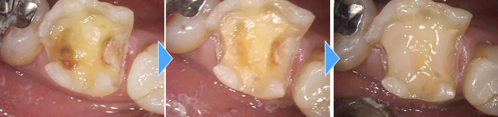 古いレジンを除去したところ、やはり中が広範囲でむし歯になっていました。むし歯を取り除き、神経を保護する処置も同時に行いました。