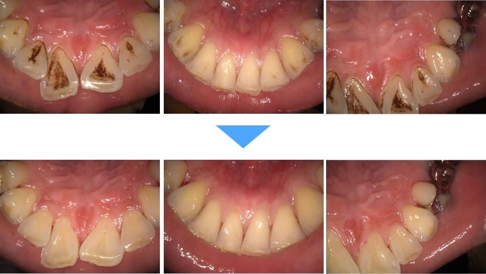 こちらの患者さまは、当院にて歯並びを綺麗にする矯正治療(インビザライン)を行っていく前に着色を落としていきたいとの事で、着色取り(エアフロー)を行いました。コーヒーが好きとの事で、生活習慣による着色リスクは高く、定期的な着色取りが必要になると考えられますが、エアフローであれば歯の表面に傷をつける事なく綺麗に着色を落とす事ができます。結果綺麗になり満足して頂くことができました。