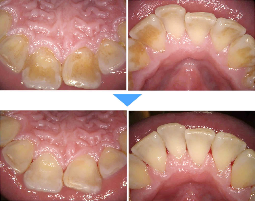 まずは歯周病治療を行い、歯茎の状態を整えてからエアフロークリーニングを行いました。持ちをなるべく良くするため、ハイドロキシアパタイト(歯の主成分)配合のトリートメント処置もエアフロー直後に行っています。術後は気になっていた着色が取れて綺麗になり、トリートメントの効果で歯の表面がつるつるして気持ちが良いと、満足いただけました。