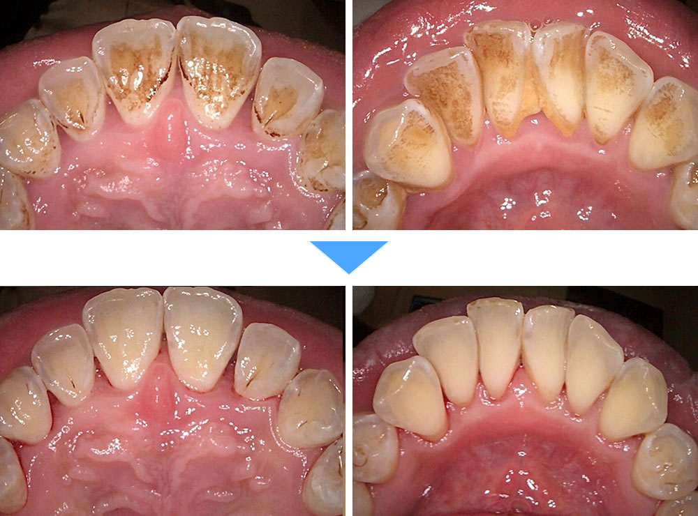 こちらの患者さまは着色が気になるとの事で御来院されました。歯石もついていたのを綺麗にしたいとの事で、まずは保険診療にて歯石取りを行っていきました。当日は歯石取りをした後に出血があったため、別日にてクイックジェットを用いて着色の除去を行いました。着色も取れて綺麗になり満足して頂く事ができました。