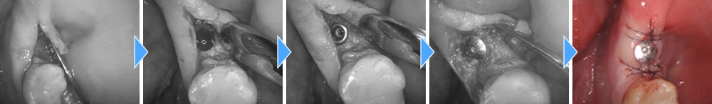 歯根破折のため、骨の欠損範囲が大きく、抜歯後半年ほど時間を置いてからインプラント埋入のオペをしました。インプラント埋入と同時に骨造成(骨を増やす処置)も行いました。