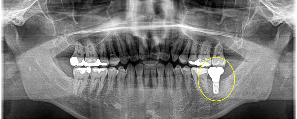 レントゲン検査の結果、過去に他院で治療した歯の根っこが割れていることが確認できました。歯根が破折してしまっており、歯を残すことが難しいため、破折歯を抜歯後にインプラントでの治療を選択されました。