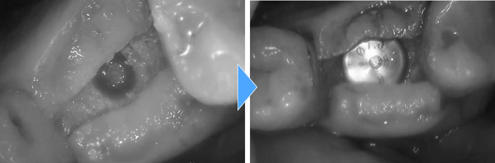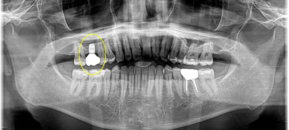 まずCT撮影し検査をしました。検査の結果、当該歯の周りの骨が感染により溶けてしまっていて、その範囲が広範囲に拡がっていることが分かりました。歯を保存する事ができないため、抜歯と診断しました。抜歯後の治療法を患者さまと相談をしたところ、ブリッジではなくインプラント治療をご希望されました。