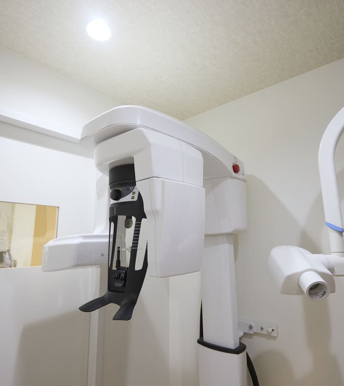 歯科用CTはお口の中を三次元の立体画像で撮影できる装置です。 従来の平面的なレントゲン写真では分からなかった、顎の骨の厚みや硬さ、神経や血管の正確な位置関係、歯の根の複雑な形状などを、あらゆる角度から詳細に把握することができます。 インプラント治療における安全性向上 インプラントを埋め込む際、顎の骨の中にある重要な神経や血管を傷つけないことが絶対条件です。 CTによる三次元的なシミュレーションを行うことで、インプラントを埋め込む位置、角度、深さをミクロン単位で計画でき手術の安全性を極限まで高めます。 骨の量が少ない難症例においても、骨を造成するなどの適切な処置を判断するための不可欠な情報をもたらします。 親知らずの抜歯や根管治療にも 複雑に横たわった親知らずの抜歯や、歯の根が複雑に枝分かれしている場合の根管治療(歯の神経の治療)においても、CTは威力を発揮します。 事前に歯や神経の正確な状態を把握することで、手術時間の短縮や治療後の痛み・腫れといったリスクの軽減に繋がります。