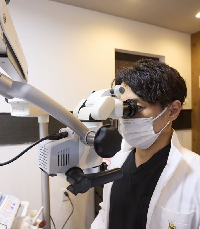 マイクロスコープは視野を最大で20倍にまで拡大できる、いわば「歯の治療専用の顕微鏡」です。 肉眼では到底見ることのできない、歯の根の内部や詰め物・被せ物と歯との微細な隙間などを明るく照らし出して鮮明に映し出します。 「再発させない」ための精密根管治療 根管治療の成功率を左右するのは、細菌に感染した神経をいかに徹底的に除去できるかにかかっています。 マイクロスコープを用いることで、髪の毛よりも細い複雑な根管も見逃すことなく隅々まで清掃・消毒することが可能です。 これにより治療後の再発リスクを大幅に低減し、歯の寿命を延ばすことに貢献します。 健康な歯を、できるだけ削らないために 虫歯治療においても、マイクロスコープで「虫歯に侵された部分」と「健康な部分」を正確に見分けることで、削る必要のない健康な歯質を最大限に残すことができます。 これは歯の強度を保ち、将来的な歯の破折などを防ぐ上で非常に重要です。