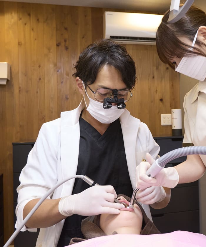 歯科医師が診療中に常に装着している眼鏡のようなものが拡大鏡(ルーペ)です。 マイクロスコープが特定の精密な治療で用いる「固定式の顕微鏡」であるのに対し、ルーペは日常的なあらゆる処置の精度を高めるための「ポータブルな拡大鏡」と言えます。 虫歯の治療や歯のクリーニング、歯石除去などすべての治療において視野を拡大して行うことで、細かな見落としを防ぎより質の高い治療のご提供に繋がっています。